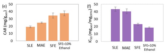 Moreover, IC50 presented a decreasing trend with the following order: SLE (43.51 mgextr/mgDPPH) > MAE (40.49 mgextr/mgDPPH) > SFE (23.17 mgextr/mgDPPH) > SFE-10% ethanol (18.66 mgextr/mgDPPH; Figure 7f), which is inversely proportional to antioxidant power. Carotenoids are valuable bioactive components that present a notable antioxidant activity [59]. Moreover, chlorophyll content can positively affect antioxidant power in case of high concentration [61]. Consequently, the chlorophyll and carotenoid richest extract emerging from SFE-10% ethanol presented the strongest antioxidant activity.