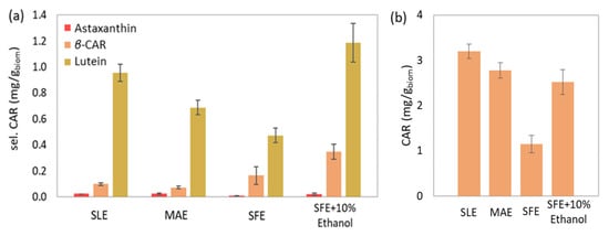 The total carotenoid content presented an increasing trend with the following order: SLE (19.06 mg/gextr) < MAE (24.88 mg/gextr) < SFE (34.61 mg/gextr) < SFE-10% ethanol (37.60 mg/gextr; Figure 7e). Similarly, the selected carotenoid content followed the same increasing trend (Figure 7d). Carotenoids are non-polar components consisting of non-polar hydrocarbons and more polar xanthophylls [73]. Among the abundance of carotenoids, the hydrocarbon β-carotene, as well as the xanthophylls, lutein, astaxanthin, canthaxanthin, violaxanthin and zeaxanthin have been identified in C. vulgaris biomass [8,74]. Utilizing a polar solvent during conventional SLE favored the extraction of lutein and other more polar carotenoids over the non-polar β-carotene. Providing microwave power through MAE using the same solvent simply enhanced the solubility of more polar carotenoids. Applying SFE with a non-polar solvent increased both hydrocarbons and xanthophylls, while the addition of a polar cosolvent during SFE-10% ethanol enhanced the coextraction of more polar carotenoids (e.g., lutein) and led to the extract with the highest carotenoid content.
