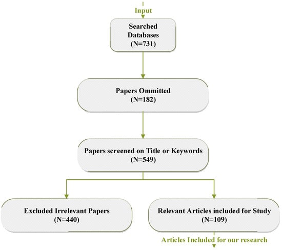 We used different searching keywords to find relevant studies: Set 1: “GWL” [32], “Ground-Water-level” [33]; and “Groundwater Level prediction” [34]; set 2: “Prediction”, “forecasting”, “Deep Learning”, “analysis”, “estimation”. We used the keyword AND between set1 and set2, and the OR operator was used between keywords in a set. Figure 2 illustrates the relevant and irrelevant papers selection process. Once read through the database, 731 papers met the search criteria. One hundred and eighty-two (182) duplicates were excluded from this analysis. After reviewing the titles and journals, 440 were excluded from the review because they did not go through the GWL criteria. After a thorough reading of these articles, 109 articles were finally analyzed.