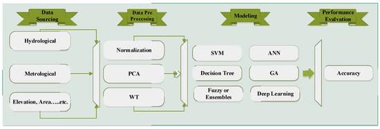 Forecasting is achieved using the latest and past collected data to forecast the future. This review is focusing on the evaluation of the GWL as a regression problem, and researchers investigated different types: the SVM, ANN, DT, ANFIS, GP, hybrid, and genetic models. A novel type (O) was created by introducing new algorithms that do not fit any of the former categories. ANN [47] methods are the most frequently used technique in GWL forecasting, and the number of ANN-based studies increases every year. Figure 3 shows the groundwater prediction process.