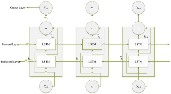 In the above equations, hf represents the forward layer LSTM output and is the backward layer LSTM output. The final output value of the hidden layer is computed by combining the results of forward and backward layers [93].