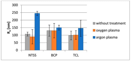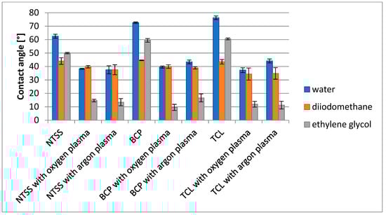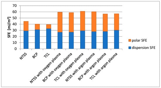 The type of material and SFE values of non-activated films had no significant effect on the SFE values of oxygen plasma-modified films (Figure 2). In the case of argon plasma activation for NTSS films, slightly better results were obtained. Moreover, for all materials regardless of the type of gas used for activation, the polar component of SFE increased significantly (110–378%), while the dispersion component of SFE decreased (4–13%). At the same time, regardless of the type of gas used, the largest change in the dispersive component of SFE was observed for BCP films, while the polar component of SFE was observed for TCL films. In addition, a significant change in surface polarity was observed for all films as a result of activation—the polar component of SFE was increased at least twofold (NTSS) and at most fourfold (TCL with oxygen plasma).