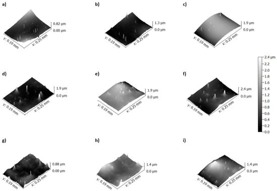 Surface topology of PLA films: (a) NTSS before plasma activation, (b) NTSS after oxygen plasma activation, (c) NTSS after argon plasma activation, (d) BCP before plasma activation, (e) BCP after oxygen plasma activation, (f) BCP after argon plasma activation, (g) TCL before plasma activation, (h) TCL after oxygen plasma activation, (i) TCL after argon plasma activation.