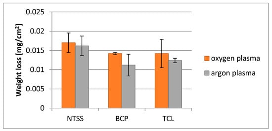 Another parameter to determine material degradation that is easy to measure, besides roughness, is the change in sample weight. A change in the mass of a sample can indicate the removal of contaminants from the surface of the material, oxidation of the material, and etching of the material []. In general, the mass is reduced as a result of defragmentation of the polymer and removal of degradation products to the environment. For all films, greater weight loss was observed as a result of oxygen activation than argon activation (Figure 5). This may be related to the fact that during oxygen plasma activation, products weakly bound to the sample surface are formed on the surface of the modified PLA [,]. Moreover, the largest weight changes were observed for NTSS film. This may be due to its much smaller thickness compared to the other films. For BCP and TCL films, the changes were at a similar level.