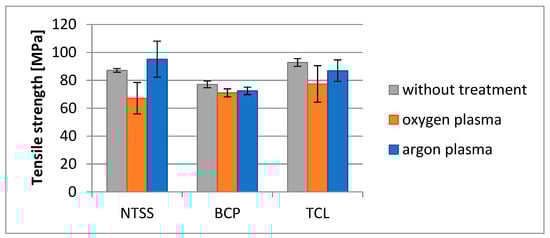 Plasma activation caused a reduction in the tensile strength of all the oxygen-plasma-activated films (Figure 6). Considering the weight loss of the activated samples, it can be concluded that material degradation has occurred, translating into lower tensile strength values. However, it should be emphasized that the observed changes are not significant enough to affect the application of the materials. Moreover, it is worth noting that argon plasma has no significant effect on the tensile strength of the material. This is due to the fact that during argon activation there is crosslinking of polymer chains, while with oxygen activation the main mechanisms are surface oxidation accompanied by chain scission rather than crosslinking.