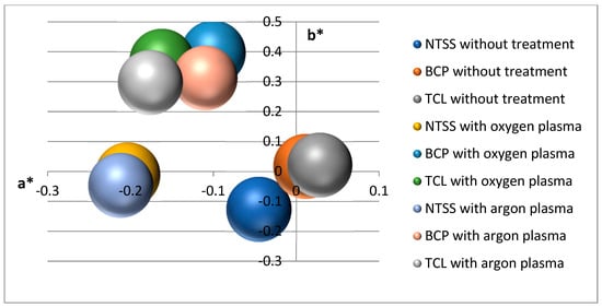 Color changes of the film due to plasma activation (the axes a* and b* describe the green-red and blue-yellow opponent colors, respectively).