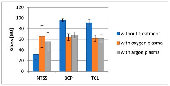 In addition to color, gloss is an important parameter characterizing quality. All of the tested films are materials with very high gloss, although for NTSS film, much lower values were recorded for measurements obtained with a measurement geometry of 20° (Figure 8). Moreover, for this material, quite large differences were observed for the measured values in the transverse and longitudinal directions, both for non-activated samples and those subjected to different types of activation. NTSS films, unlike BCP and TCL films, gained luster as a result of activation. Nevertheless, for the latter, no negative effect of activation can be concluded based on the obtained results, as the recorded changes are considered insignificant and are invisible to the observer.
