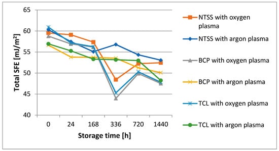 Analysis of the course of aging of plasma activation effects based on the SFE value confirms the conclusions drawn from the contact angle analysis. Namely, the type of gas used for plasma activation has a significant effect on the course of changes, while the type of film has a slight effect, although the NTSS film is more resistant to aging than the other films tested (Figure 9).
