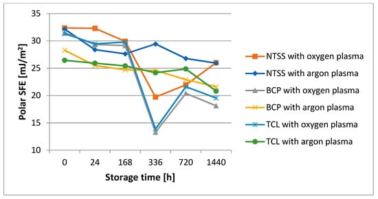 In addition, for all oxygen plasma-activated films, the lowest SFE values were recorded after 14 days of storage, and increased with longer storage time. This is closely related to the previously discussed changes in WCA with polar liquids, where a sudden peak in values was observed after 14 days, and is also consistent with the changes in the polar component of SFE (Figure 10). It is noteworthy that the reduction in SFE after 14 days is so significant that it is only slightly higher than the SFE of unmodified films (higher by 3.82, 3.85, and 5.84 mJ/m2 for NTSS, BCP, and TCL films, respectively). By comparison, after 30 days it already increases to a value of about 50 mJ/m2 for all the films tested, which again should be satisfactory from the point of view of further applications of the materials (e.g., bonding and printing).
