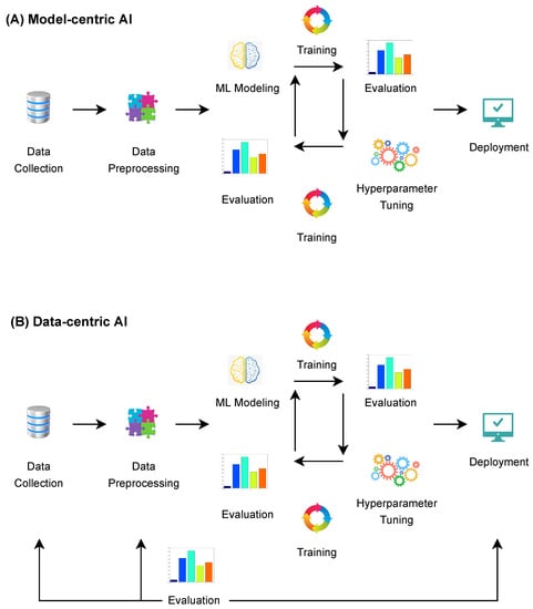 | System development lifecycle | Successive upgrade of a model (algorithm/code) with fixed volume and type of data | Continuous improvement in the quality of data with fixed model hyperparameters | [19,20] |