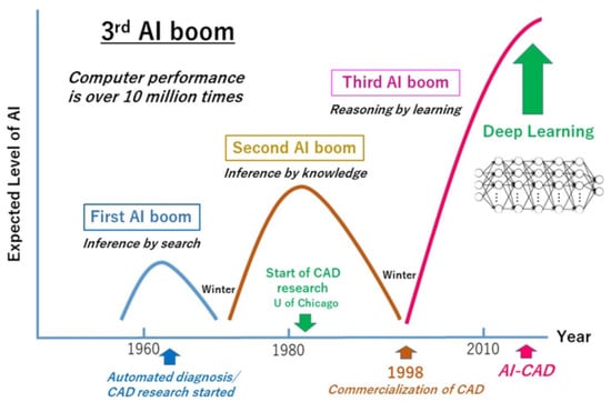 Current AI. The 3rd AI hype, in which previous computer-aided detection/diagnosis for medical images is augmented by deep learning, is preceded by two cycles of AI hype; source: [24].