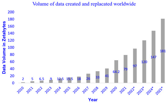 According to International Data Corporation (IDC), a market intelligence company specialised in measuring created, consumed, and stored data each year, Global Datasphere would continue to expand almost exponentially (Figure 4). For example, while the volume of data created and replicated in 2010 did not exceed a lean value of 1 zettabyte (ZB), it reached a value of 64.2 ZB in 2020 [34]. It is expected that more than 180 ZB will be created in 2025 (1 ZB = gigabytes).