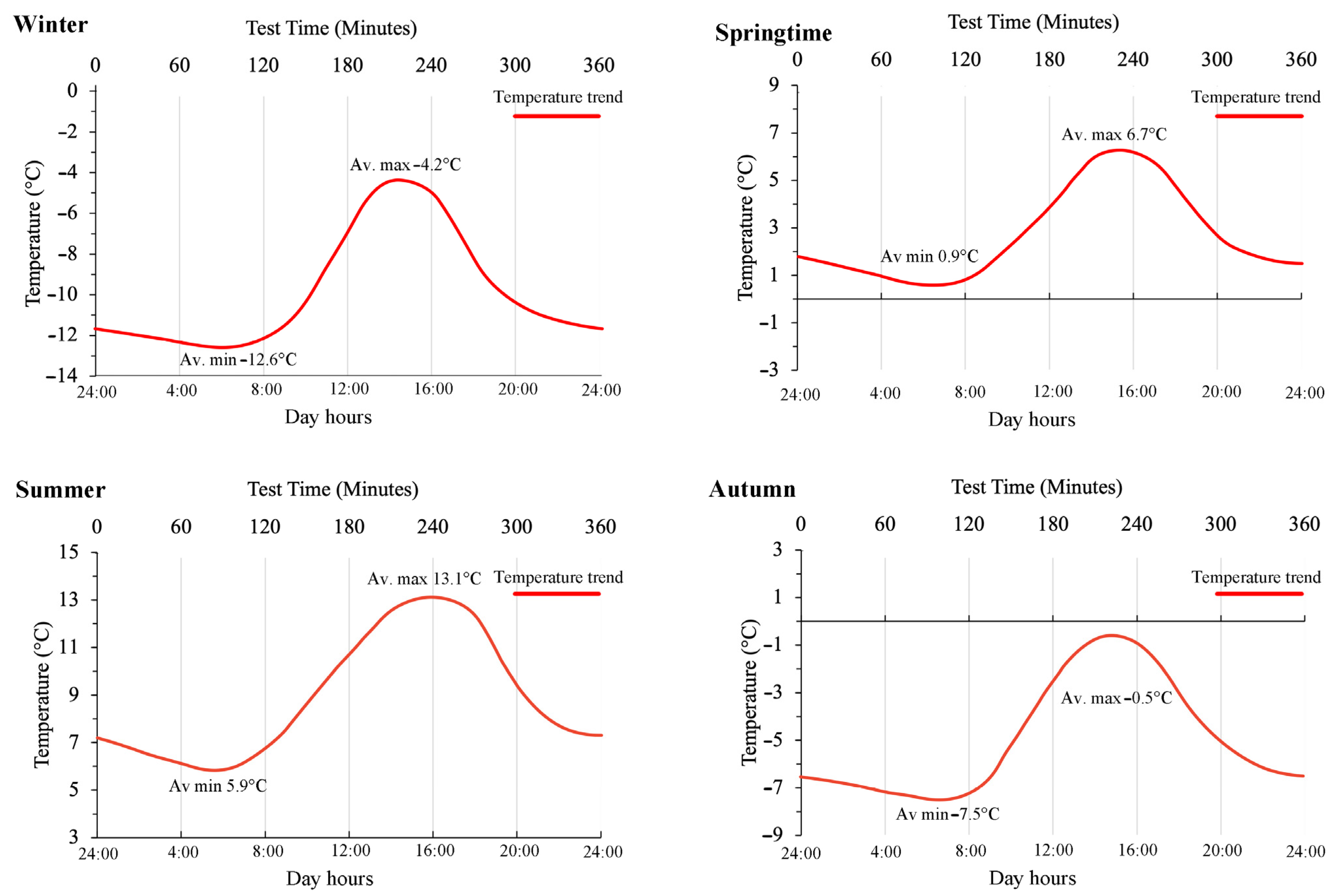 | Spring—repeated for 1 month | 2 h|0.9 °C | 1:30 h|0.9 °C→−6.7 °C | 2:30 h|6.7 °C→0.9 °C | |