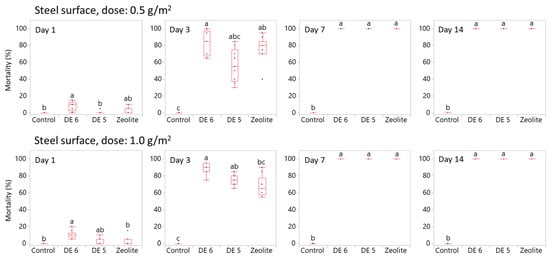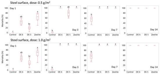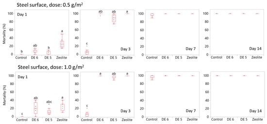 Mortality (%) of R. dominica adults after exposure for 1, 3, 7 and 14 d at three different doses [0 (control), 0.5 and 1 g/m2] of DEs and zeolite applied on steel surfaces (boxplots followed by the same letter are not significantly different, according to the Dunn test at p < 0.05, where no letters exist, no significant differences were noted).
