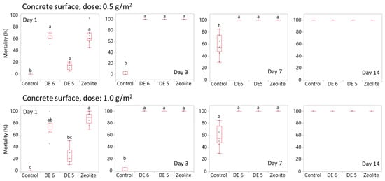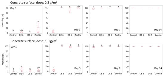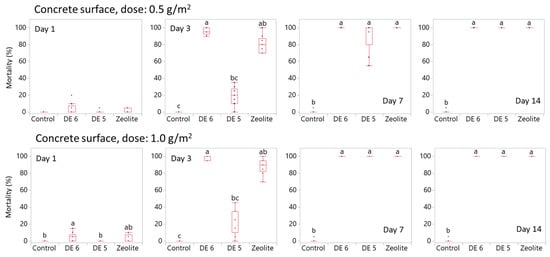 Mortality (%) of R. dominica adults after exposure for 1, 3, 7 and 14 d at three different doses [0 (control), 0.5 and 1 g/m2] of DEs and zeolite applied on concrete surfaces (boxplots followed by the same letter are not significantly different, according to the Dunn test at p < 0.05, where no letters exist, no significant differences were noted).