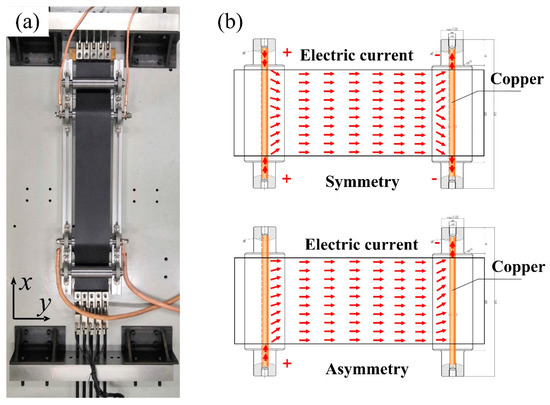 where Tm is the temperature, t is the time, ρm is the density, cm is the specific heat capacity, Rm is the resistivity, Sm is the cross-sectional area of Mg strip, IA is the root mean square current, Je is the root mean square current density. According to Equation (1), Joule heat is linearly related to the square of current density, and the temperature rise of Mg strip can be calculated by the current. In this way, the characteristics of the electric field distribution can be obtained by regression based on the distribution law of the temperature field, and feedback control of the temperature and electric pulse parameters can be achieved. It is clear that an accurate measurement of the distribution of the current density field of a Mg foil under different conditions is significant for the realization of a high-precision electric rolling process for wide Mg foils.