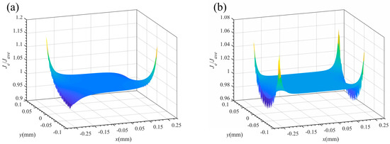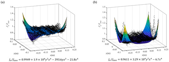 The Je/Jave measurement value surface fitting: (a) 9Cr2Mo−asymmetry−5.0A/mm2; and (b) 9Cr2Mo−symmetry−5.0A/mm2.