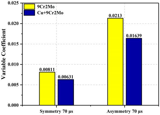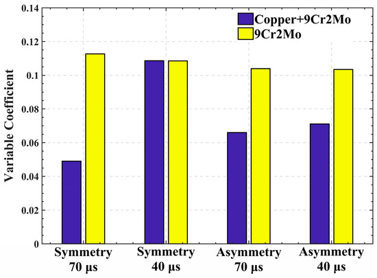 In order to better evaluate the uniformity distribution characteristics of the electric field, the Je/Jave of the sample after one second was calculated according to Equation (1). Figure 3 shows the measured values of the electric field, with a peak Je/Jave less than 1.4 for the cylindrical electrode electrical pulse tensile test. The Je/Jave peak is lower and the electric field is more uniform after applying the packet Angle. In order to eliminate the effects of measurement scale and dimensionality, the coefficient of variation was used to reflect the uniformity of different electrode materials, electrode connection modes and current densities. The smaller the coefficient of variation, the smaller the dispersion of the data. The formula for the coefficient of variation is as follows