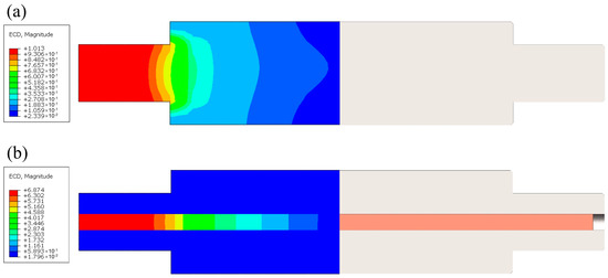 Figure 5 shows the Je/Jave distribution on the surface of the Mg strip for the solid steel used for the electrodes, which is generally consistent with the experimental results in Figure 3. The peak current density appears at the electrode connection, where the transverse distribution range of the asymmetric connection Je/Jave is 0.215 and the transverse distribution range of the symmetric connection Je/Jave is 0.098. It is seen from Figure 5 that the symmetrical electrode connection can significantly increase the uniformity of the electric field, and it is easier to achieve the uniform distribution of temperature. The interaction between the electric fields at the cathode and anode electrodes was not observed, with a distance of 466 mm between the cathode and anode electrodes. Figure 6 shows that the variation coefficient of the Je/Jave can be reduced with the copper-embedded steel by using the guild rolls, which improves the uniformity of the electric field distribution. In particular, when a symmetrical electrode connection is adopted, the uniformity of electric-thermal coupling field in a wide Mg strip can be greatly improved. Figure 7 shows that the excellent conductivity of the copper leads to an accumulation of current in the copper core, which significantly improves the axial guiding electrical effect. The axial direction current distribution of the guide roll was uniform, leading to the transverse distribution of the electric field in the wide Mg alloy strip more uniform, which is beneficial for improving the uniformity of the transverse temperature distribution and microstructure.