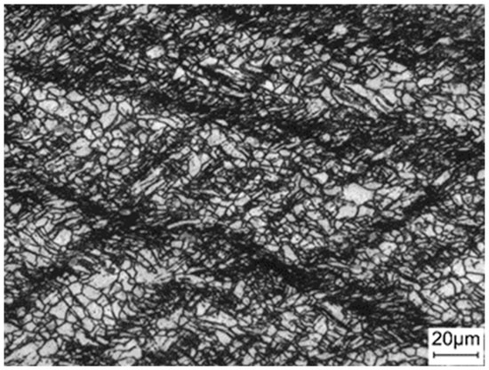 Based on the above conclusions, it is demonstrated that the symmetric connection and copper-embedded steel roller can significantly improve the electric field uniformity of Mg strip, and indirectly modify the temperature distribution and microstructure of Mg alloy in the EPR. In order to verify the EPR effect of Mg alloy strip under the condition of symmetrical electrode connection, the anode of the power supply was connected on both sides of the work roll. The Mg alloy billet was cut into sheets with dimensions of 500 mm × 40 mm × 1.0 mm. The sheets were rolled to 0.6 mm thickness though three passes without any off-line intermediate heat treatment in the process of the EPR. Figure 8 shows that the rolled Mg strip produces a large number of twins and shear bands. Then, a single pass electroplastic rolling with an 18% reduction rate was performed. The effective current density was 28.5 A/mm2, and the rolling speed was 25 mm/s.