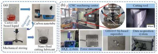 GH4169 Ni-based superalloy processing system: (a) nanofluid preparation process and (b) experimental system.