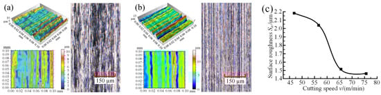 Variations in GH4169 surface roughness with cutting speed: (a) v = 47.10 m/min; (b) v = 75.36 m/min; (c) changing law.