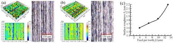 Variations in GH4169 surface roughness with feed per tooth: (a) fz = 4 μm; (b) fz = 13 μm; (c) changing law.