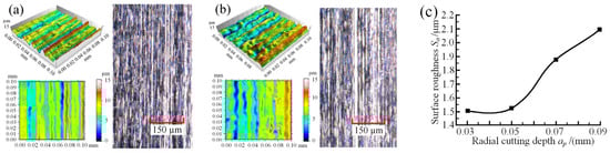 In Figure 3, the surface roughness gradually decreases with the increasing cutting speed. When the cutting speed ranged from 64.06 m/min to 75.36 m/min, the surface roughness decreased slowly. When the cutting speed increased from 47.10 m/min to 75.36 m/min, the surface roughness decreased from 2.17 μm to 1.46 μm, improving by 48.6%. The surface roughness increased gradually when the feed per tooth was from 4 μm to 9 μm, as shown in Figure 4. When the feed per tooth was greater than 9 μm, the slope increased obviously, which is due to the increase in the spacing between the adjacent milling blades. Therefore, on the premise of meeting the surface roughness of the workpiece, the feed per tooth can be appropriately increased to improve the processing efficiency. As can be seen from Figure 5, with the increase in the radial cutting depth, the surface roughness of the workpiece increased significantly. When the radial cutting depth was higher than 0.05 mm, the increase rate of the surface roughness accelerated.