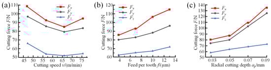 Variations in GH4169 cutting force with different milling parameters: (a) cutting speed; (b) feed per tooth; (c) radial cutting depth.
