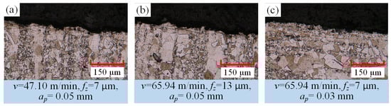Variations in GH4169 section characteristics with different milling parameters: (a) v = 47.10 m/min, fz = 7 μm, ap = 0.05 mm; (b) v = 65.94 m/min, fz = 13 μm, ap = 0.05 mm; (c) v = 65.94 m/min, fz = 7 μm, ap = 0.03 mm.
