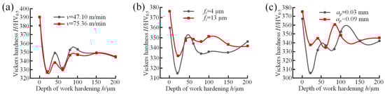 Variations in hardness with different milling parameters: (a) cutting speed; (b) feed per tooth; (c) radial cutting depth.