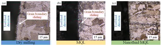 Microstructure of different cooling modes: (a) dry milling; (b) MQL; and (c) nanofluid MQL.