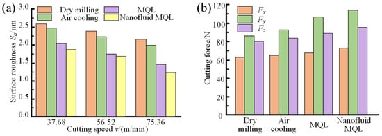Surface roughness and cutting force changes with cutting speed and cooling modes: (a) surface roughness; (b) cutting force.