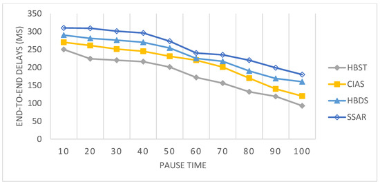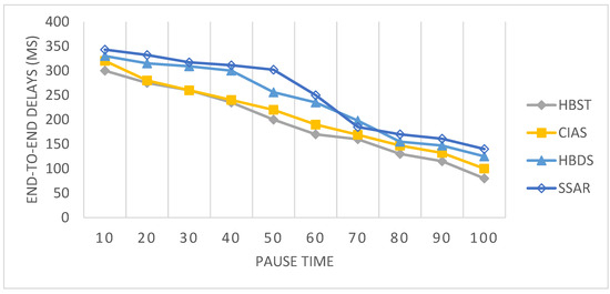 The results for end-to-end delay are shown in Figure 9. The results show that once the network is set up, the HBST starts performing well. At stop time 10, the HBST’s packet delays were 7.40% shorter than those of the CAIS, 13.80% shorter than those of the HBDS, and 19.35% shorter than those of SSAR. As the nodes start communicating and a credible community is formulated, delays in the HBST decrease, as seen in the results. From pause time 30 to 100, it improves further. This is due to forming a credible community to forward messages to its neighbor nodes. At pause time 60, delays were 21.81% shorter than those of the CAIS, 23.56% shorter than those of the HBDS and 28.34% shorter than those of the SSAR. Similarly, at pause time 100, HBST had shorter delays than CAIS, HBDS, and SSAR techniques by 22.5%, 41.87% and 48.34%, respectively.