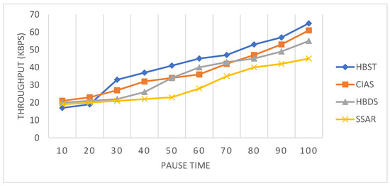 The proposed mechanism did not work effectively at the initial pause times, since the frequency of interactions heavily influences it. The throughput dramatically increases after pause time 20 when the communities were formed following the initial input operations. The throughput of the HBST began to increase as the community commutated and nodes began to show interest in the community. At pause time 60, HBST had a throughput that was 28.27% higher than that of the CAIS, 50% higher than that of the HBDS, and 56.52% higher than that of SSAR. Before pause 20, the continuous improvement in the throughput was due to detecting selfish nodes in the network by the HBST protocol and isolating them in a separate domain to improve the honesty parameters, and the increasing traffic volume.