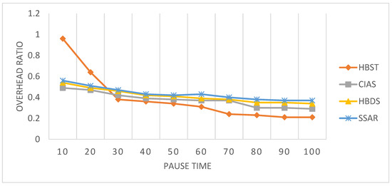 The impact of the overhead ratio on network performance is depicted in Figure 7. The results show that HBST initially carries a greater overhead. The increased overhead is caused by the need to establish a trustworthy community, give nodes enough time to begin interactions with one another, and encourage nodes to take an interest in the community. As a legitimate community is established and grows, the overhead falls. At pause time 10, the overhead ratio of the HBST was 48.96% higher than that of the CAIS, 43.75% higher than that of the HBDS, and 41.67% higher than that of the SSAR. The other three approaches, CAIS, HBDS, and SSAR, have demonstrated a lower overhead ratio than the HBST at pause time 20. After establishing a credible community, the overhead ratio of the HBST began to improve. As seen in the results at pause time 60, the overhead ratio is 16.21% lower than that of the CAIS, 20.51% lower than that of the HBDS and 27.90% lower than that of the SSAR. Similarly, it improved further at pause time 100, achieving a lower overhead ratio.