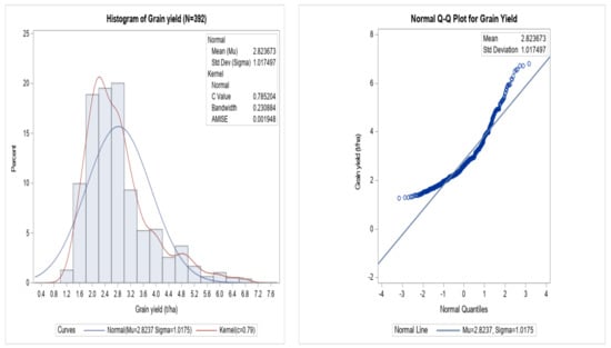 The Shapiro–Wilk test is important to test the normality assumption of the grain yield that tests the hypothesis of no significant departure from normality for the observation of a sample size less than 2000. The test statistic for the Shapiro–Wilk test is 0.9548 with the associated p-value < 0.05, which indicates rejecting the null hypothesis. The normality of the distribution of grain yield is highly significant, which reveals that the distribution of grain yield significantly differs from the normal distribution.