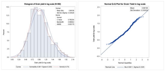 One of the remedial measures for violating the normality assumption is transforming the data using the log transformation technique. It is the most familiar technique for transforming non-normal data set into a normal one []. Due to the non-normality of the observations of grain yield, to maintain the normality assumption, the data points are transformed using the natural logarithmic function. After that, the histogram of the new data set indicates the symmetrical nature of the distribution, which shows the satisfaction of the normality assumption (left hand side of Figure 2). The scatter plots of the new data points fitted on the normal line show that the new data sets have a normal distribution (0.9811 ± 0.33) with a lower standard deviation compared to the untransformed data values of the grain yield (2.82 ± 1.017) (right hand side of Figure 2).