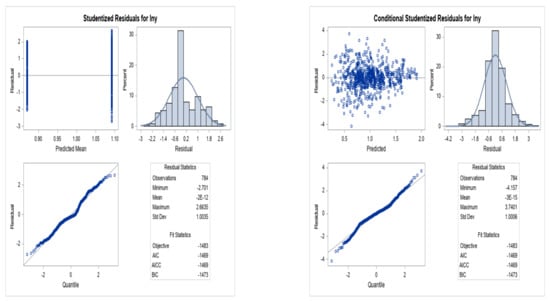 Given the random effects, the conditional the Studentized residual for grain yield represents the difference between the observed and predicted values. The scatter plot depicts the conditional residuals’ homoscedasticity. The residual statistics are shown in the lower right, with the mean of the residual being zero and the standard deviation being one. The residual versus predicted value of the conditional is represented by the left top plot. The Studentized residual indicates the homoscedasticity of the conditional error, and the histogram and Q-Q plot of the residual show that the conditional residual meets the normality assumption (Figure 3).
