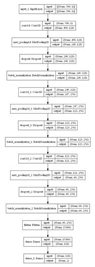 The deep learning approach includes concatenated CNNs and 1D CNNs. The proposed CNN model consists of an input layer, three convolutional, max pooling, dropout, and batchnormalization layers, a flatten layer, and a dense layer. At the input layer, the data is reduced to 500 features to be enrolled in the proposed models. The maximum pooling and convolutional layers are used to extract features from input data. The first, second, and third convolutional layers have 128, 128, and 256 filters, respectively. Each set also includes a dropout and a batch normalization layer. These layers are used to prevent overfitting from occurring. Furthermore, the flatten layer, which prepares the feature vectors for enrollment in classification, completes the connection between the feature extractors and the classification layer. A dense layer with a softmax activation function is used to deploy the classification task.