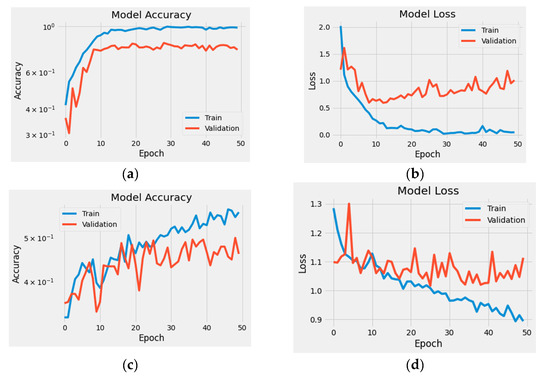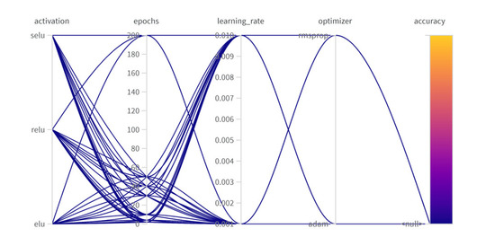 The strategy of hyperparameter selection is based on the permutations of model architecture and the training process. The model architecture trend comprises the values of filters of the convolutional layers, units of the dropout layers, and activation functions. The training process trend comprises the type of optimizer, learning rate, and number of epochs. Figure 6 and Figure 7 show samples of the learning curve for accuracy and loss which is obtained during the hyperparameter optimization. It can be observed that the performance of the model is enhanced through the runs due to the permutations of the hyperparamer values. In addition, Figure 8 shows an infograph of the accuracy with the variation of hyperparameter values. Moreover, Table 1 illustrates some iterations for the hyperparamer optimization for the deep learning model. Table 2 illustrates the selected hyperparameters for the proposed methods.