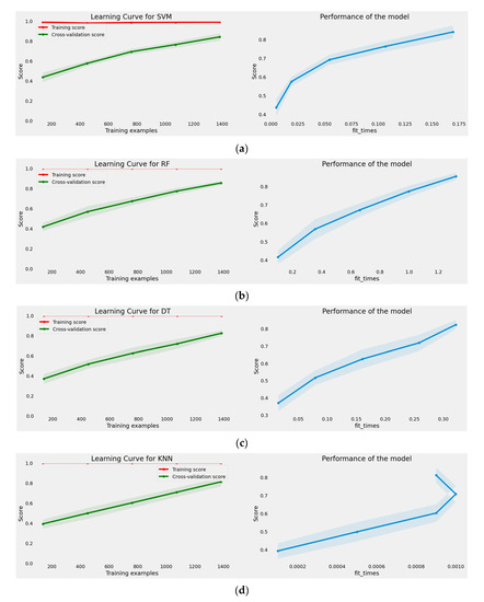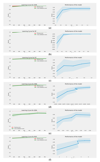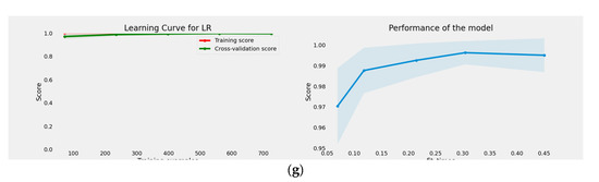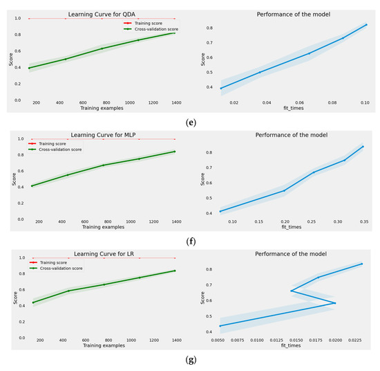 Multiclass learning and performance curves of the proposed machine learning models. (a) Learning Curve and Performance plots of The Proposed SVM Model. (b) Learning Curve and Performance plots of The Proposed RF Model. (c) Learning Curve and Performance plots of The Proposed DT Model. (d) Learning Curve and Performance plots of The Proposed KNN Model. (e) Learning Curve and Performance plots of The Proposed QDA Model. (f) Learning Curve and Performance plots of The Proposed QDA Model. (g) Learning Curve and Performance plots of The Proposed LR Model.
