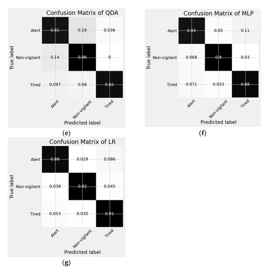 Moreover, the classification task is carried out using machine learning and deep learning approaches. The selection of classification method is carried out among the proposed methods including SVM, RF, DT, KNN, QDA, MLP, LR, CNN, and C-CNN. The optimal classification method is one which achieves a high performance prior to accuracy of detection. The proposed classification methods are carried out on the EEG signals in the time domain and the frequency domain. The performance of the proposed methods are evaluated prior to precision, recall, f1-score, and accuracy. The dataset is split into 70% and 30% for training and testing, respectively. In addition, these methods are trained and validated using k-fold cross validation, with k = 10. Furthermore, the classification task is performed in two scenarios of detection, binary-class and multi-class. The objective of the binary-class classification is to distinguish between states of alertness and tiredness. On the other hand, the objective of the multi-class classification is to classify among alert, tired, and non-vigilant states. The learning curves of the proposed machine learning methods are shown in Figure 9 and Figure 10, while the visual representation of the confusion matrices are shown in Figure 11 and Figure 12. In addition, the learning curves of the deep learning are displayed in Figure 13 and Figure 14. A visual representation of the confusion matrix of the proposed deep learning methods are shown in Figure 15 and Figure 16. Table 7 illustrates the simulation results of the proposed classification methods which are carried out on the transformed EEG signals using FFT with DWT. In a multiclass scenario, the proposed LR and RF models outperform the others with 90% and 89% accuracy, respectively, while SVM, RF and LR have 96% accuracy, for the binary-class scenario. Therefore, the proposed system consists of FFT with DWT for feature extraction and a LR classifier for the wide deployment for both binary-class and multiclass scenarios.