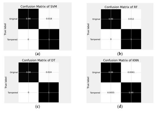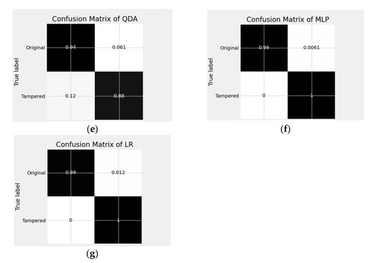 Confusion Matrix of The Proposed Machine Learning Model for Binary Classification (a) SVM, (b) RF, (c) DT, (d) KNN, (e) QDA, (f) MLP, (g) LR.