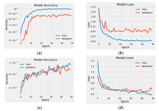 Deep learning models for binary-class scenario learning and performance curves (a) Accuracy for 1D CNN, (b) Loss for 1D CNN, (c) Accuracy for C-CNN, (d) Loss for C-CNN.
