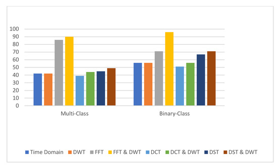 This paper proposes a system for drowsiness detection based on medical signals. This system comprises feature extraction and classification tasks. The feature extraction task is carried out using several trigonometric transformations including DWT, FFT, DCT, and DST. The classification task is performed using machine learning and deep learning algorithms. Figure 17 shows the extracted features and their importance for the output. The accomplished system comprises FFT with DWT for feature extraction and LR for classification. In this section, we discuss the performance of the proposed system in different cases including the performance of the LR classifier on the signals in the time domain and different transformations in addition to its performance with the added DWT denoising technique. Figure 18 shows a comparison of the proposed system in different scenarios including binary-class and multi-class scenarios.