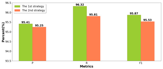 The experimental results are shown in Figure 4. The data show that the first strategy outperforms the second. we suppose the first fusion strategy emphasizes the importance of the initial character of words or N-grams. As a result, when labeling the entity’s first character, the model could detect a clear start position, making the entity easier to identify. So, we will employ the first fusion strategy in future experiments.