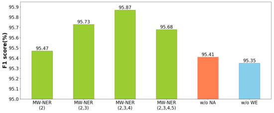 In Figure 5, the numbers in parentheses indicate different combinations of N-gram in the N-grams aggregator module. For example, “MW-NER(2,3)” indicates that MW-NER uses the 2-gram and 3-gram in the N-grams aggregator module. The experimental results could be divided into three groups, and the first group has multiple bars (filled with green) in the figure due to different hyper-parameters. By removing the N-grams aggregator, the model’s best result falls from 95.87% to 95.41%, which demonstrates that the N-grams aggregator could improve the model’s comprehension of phrases and sentences by enriching semantics. When the word encoder is removed from the model, performance suffers even more, illustrating the importance of incorporating word embeddings into the model.