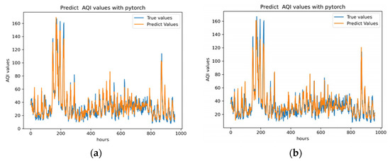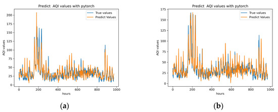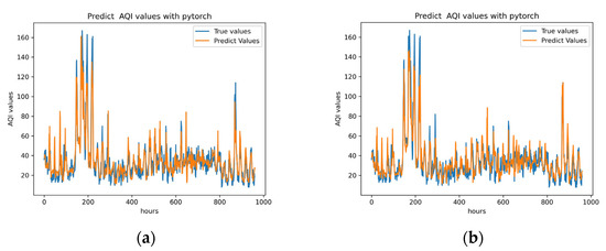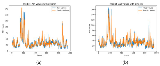 Figure 4 uses data from the preceding 24 h, or one day, to estimate the AQI value at the following step when the A-W coefficient was less than 0.2. From Table 2, since the A-W coefficient was −0.125, it fell within the interval [−0.2, 0.2], indicating that there was a low correlation between the wind speed data and the AQI representation. Thus, the wind speed data were omitted. Figure 5 uses data from the preceding 48 h or two days to estimate the AQI value at the following moment when the A-P factor was less than 0.2, which was inconsequential, and omits pressure data as a result. Figure 6 uses data from the past 168 h or week to estimate the AQI value at the following instant when the A-P coefficient was equal to −0.09, which was not significant, and omits pressure data.