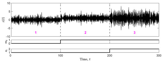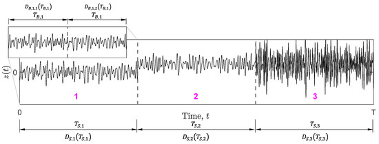 Thanks to Equation (13), the results of Section 3.2 are now extended to a non-stationary stress-time history of duration that switches between a finite number of stationary states—an example with three states (1, 2, 3) is depicted in Figure 1.